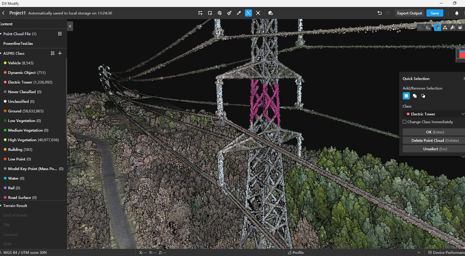 - Point cloud quick selection which can automatically identify point cloud structures and then correct misclassified point clouds. This tool is perfect for point clouds that have already been automatically classified, and enables users to quickly select specific classes (eg, powerlines, poles, trees) with a single click.
